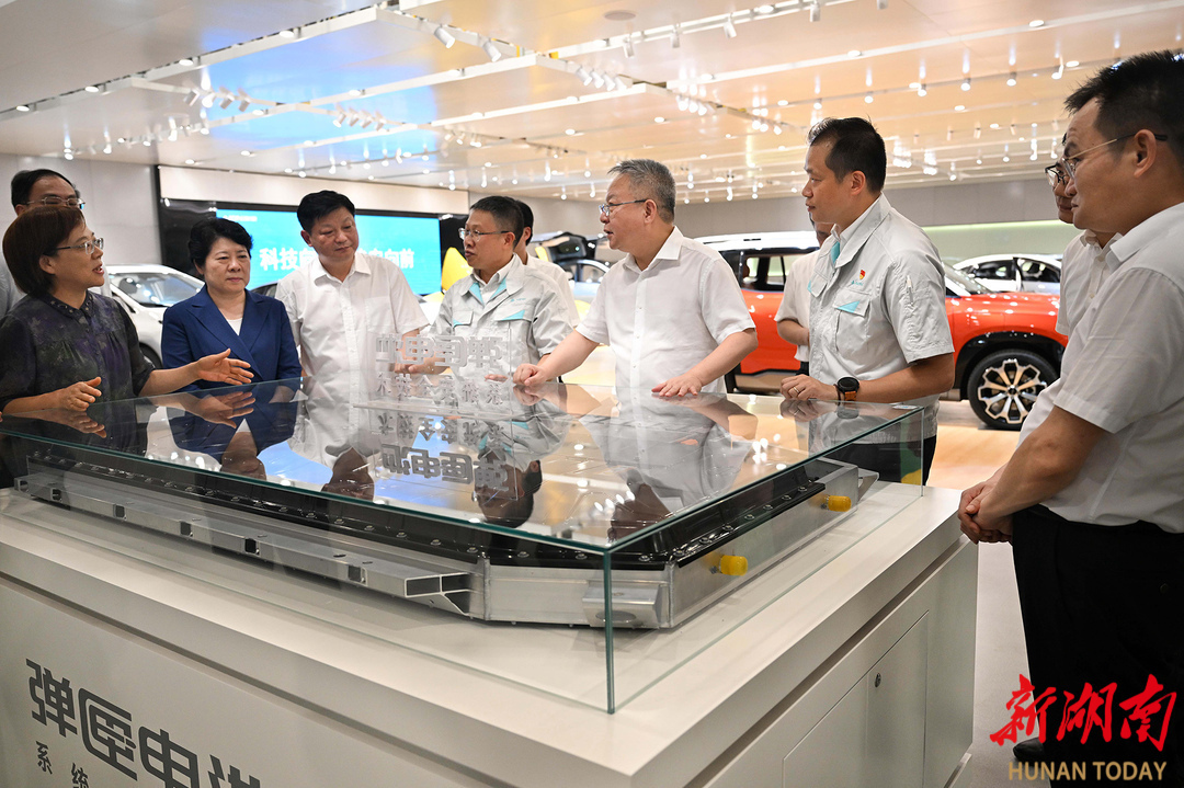 (7月10日,沈曉明在廣汽埃安長(zhǎng)沙分公司察看產(chǎn)品展示,了解企業(yè)技術(shù)創(chuàng)新和市場(chǎng)開(kāi)拓等情況。)