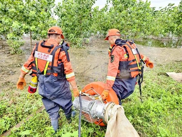 支隊抵達11號排澇作業(yè)點后,迅速架設(shè)車輛裝備,深入積水區(qū)域鋪設(shè)水帶,調(diào)試水泵壓力,確保兩臺排澇車抽水泵全部出水,每小時最大排水量約8000立方米。支隊總排水量約7萬立方米,預(yù)計24小時可排水20萬立方米。