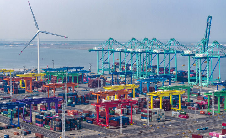 2024年7月3日,一艘集裝箱貨輪??吭谔旖蚋邸爸腔哿闾肌贝a頭(無人機(jī)照片)。新華社記者 趙子碩 攝