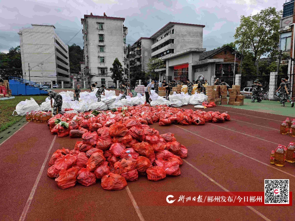 7月29日,資興市第一中學(xué)內(nèi),工作人員忙著打包、搬運(yùn)救災(zāi)物資,各架次應(yīng)急救援直升機(jī)往返于陸空之間。