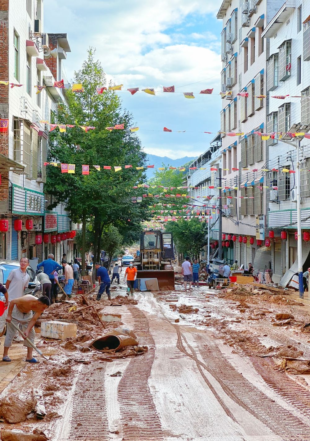 下午4時(shí)許,經(jīng)過6個(gè)小時(shí)的挺進(jìn),記者進(jìn)入八面山瑤族鄉(xiāng)集鎮(zhèn)。洪水肆虐過后,多條街道堆積起厚厚的淤泥和垃圾,當(dāng)?shù)卣M織開展清淤工作。裝載機(jī)、貨車的轟鳴聲,志愿者們手持鐵鏟鏟過地面的響聲,此起彼伏。
