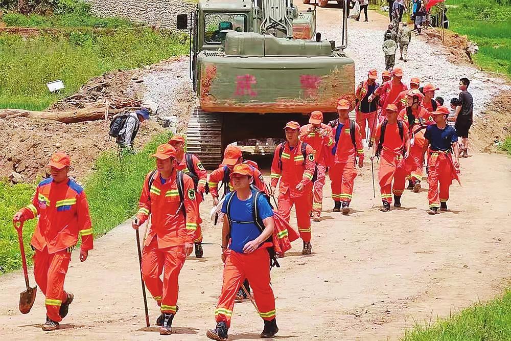 ▲救援人員徒步朝八面山瑤族鄉(xiāng)行進(jìn)(新華社發(fā))