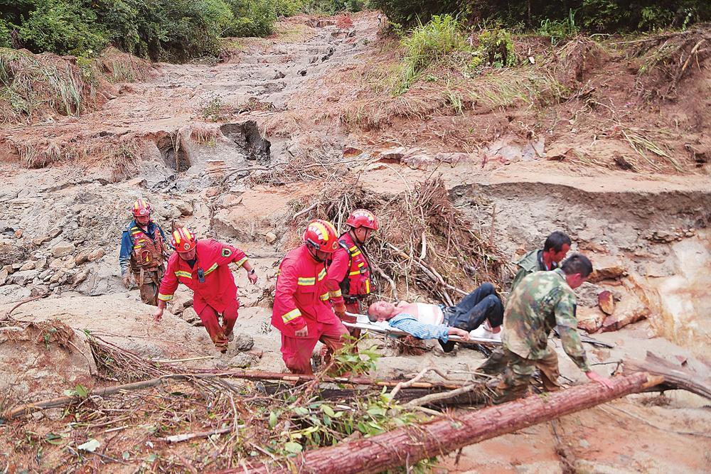 ▲救援人員在唐洞街道鏡塘村轉(zhuǎn)移被困群眾(通訊員 李科 攝)