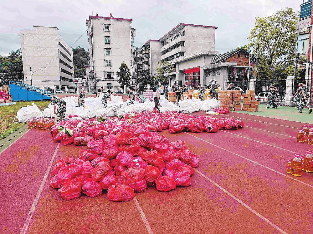 ▲資興市第一中學(xué)內(nèi),工作人員忙著打包、搬運(yùn)救災(zāi)物資(全媒體記者 謝韜 鄧楚旺 攝)