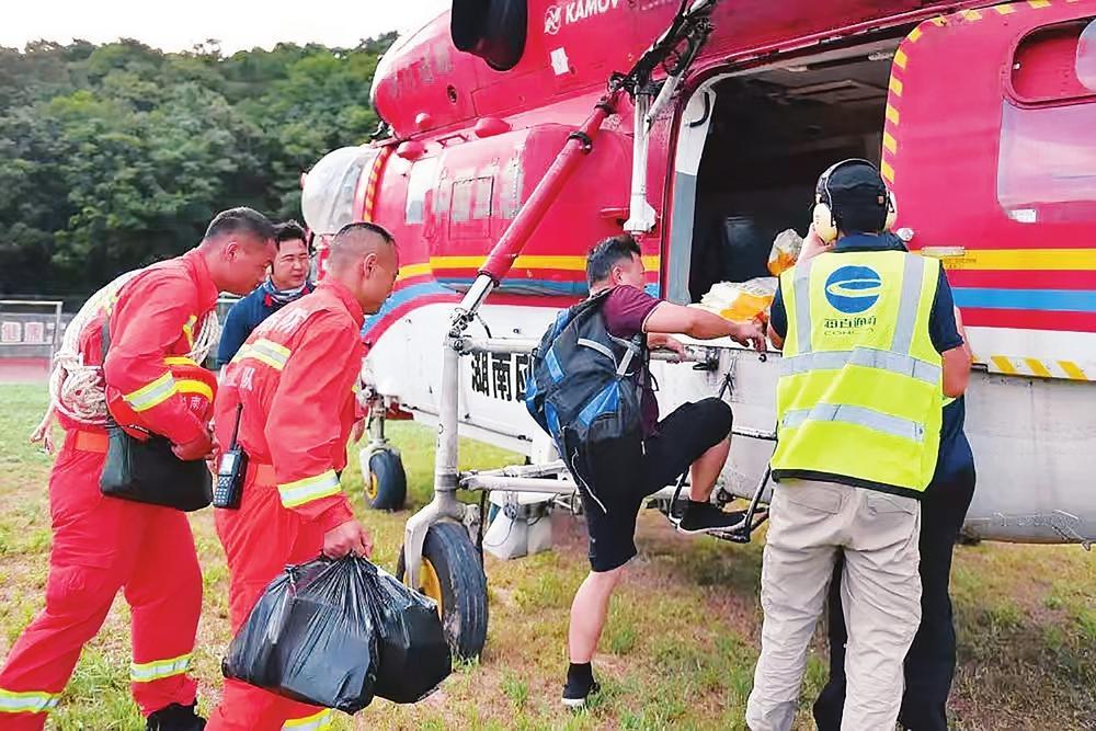 ▲八面山瑤族鄉(xiāng)衛(wèi)生院連坪分院醫(yī)生李德明登機(jī)返回連坪村參與救援(新華社發(fā))
