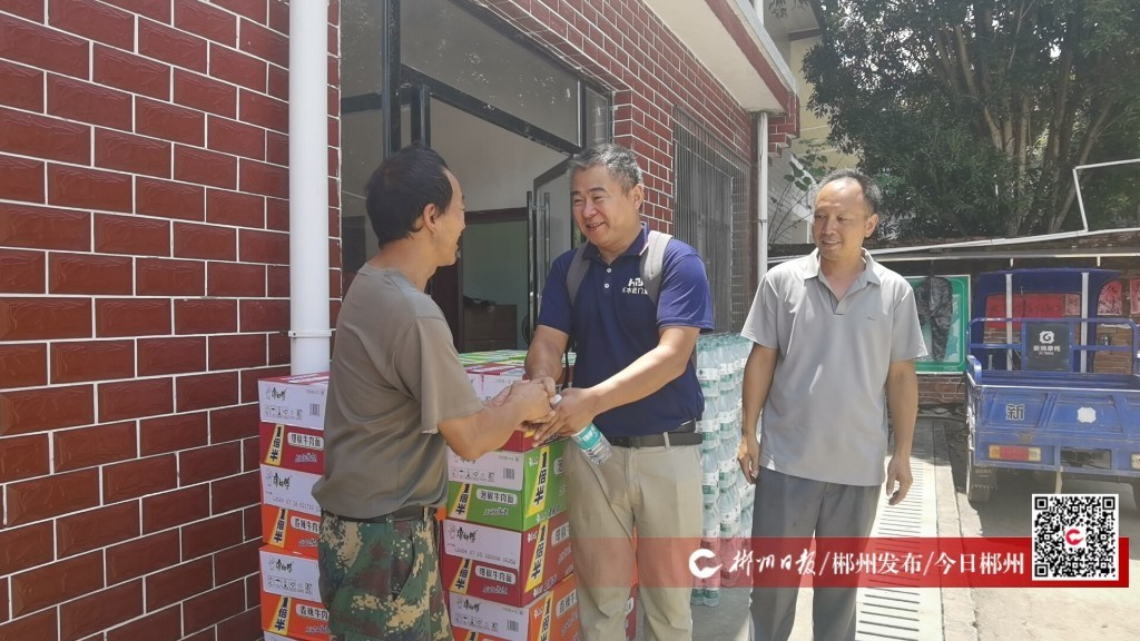 從三輪車上下來的中年男子緊緊握住受災(zāi)村民的手。這名中年男子來自江蘇省,名叫許宏利,是郴州市紅木匠門業(yè)的老板。
