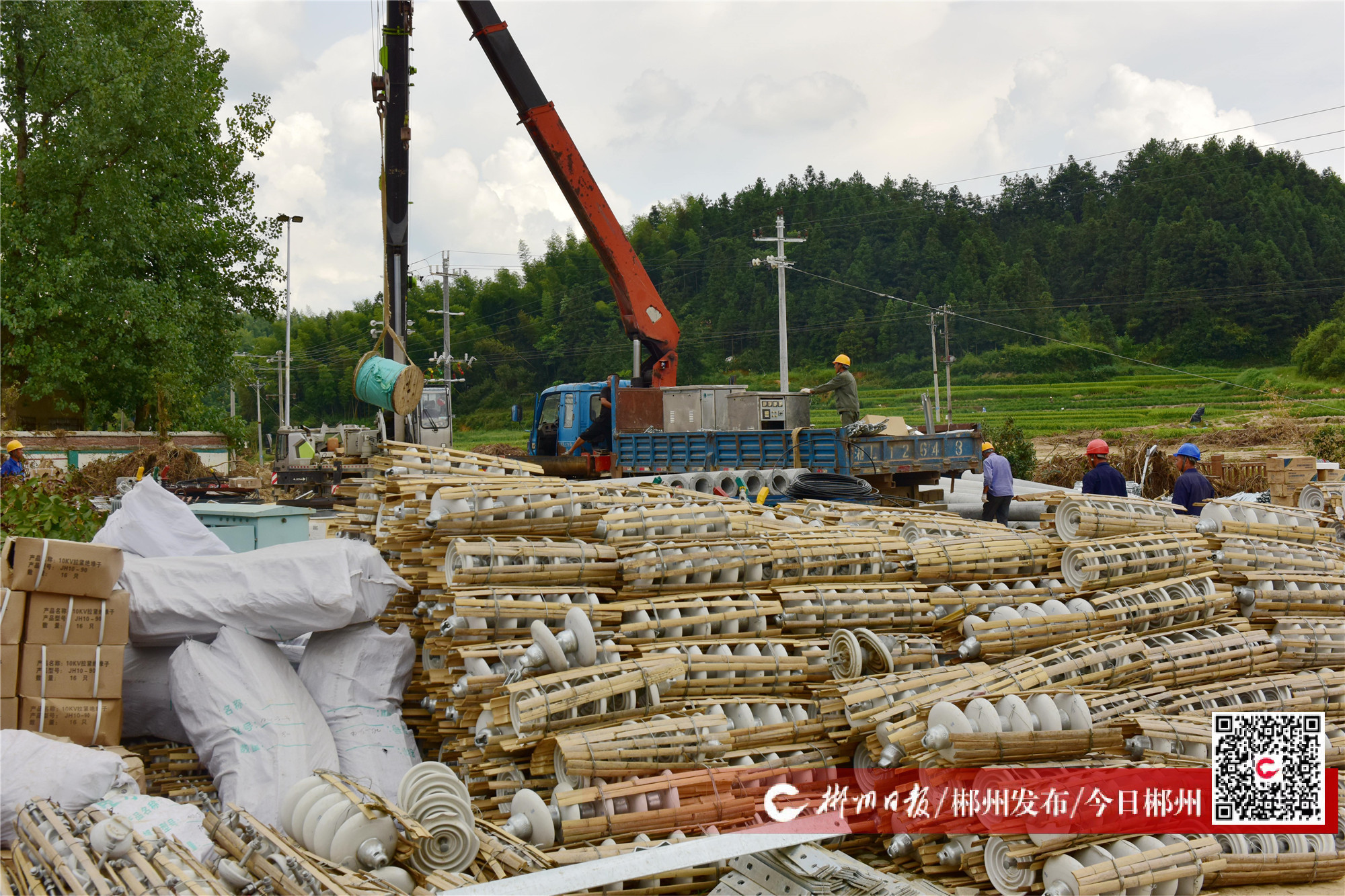 ▲8月10日,資興市州門(mén)司鎮(zhèn),電力搶修隊(duì)正在運(yùn)送電力設(shè)施。