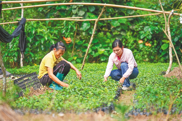 2023年4月25日,海南鸚哥嶺腹地白沙黎族自治縣南開鄉(xiāng)革新村村民在管護茶樹苗。海南日報記者 李天平 攝