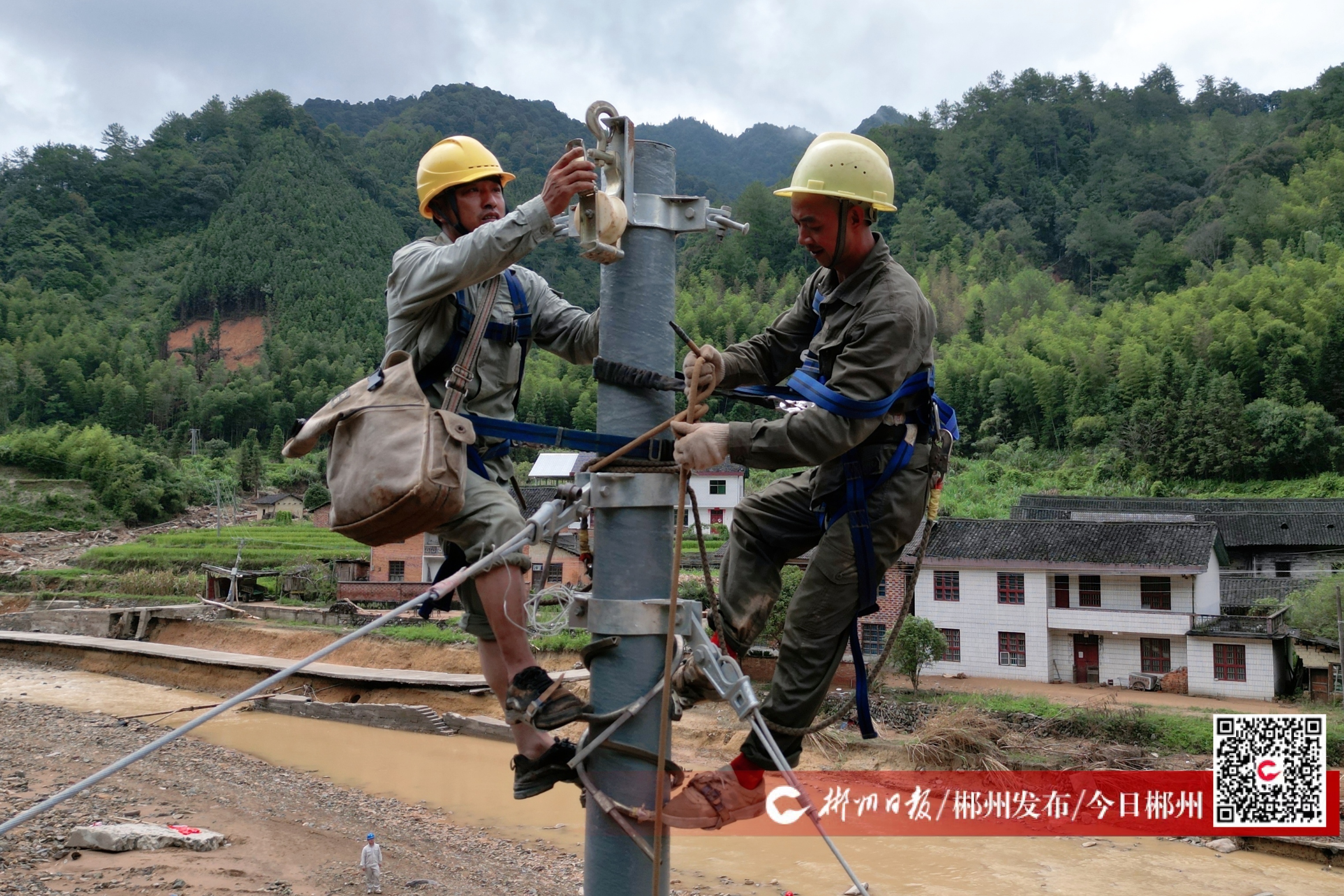 國(guó)家電網(wǎng)郴州供電公司在道路搶通前,通過(guò)直升機(jī)將部分電纜及物資空投進(jìn)村。8月14日8時(shí),公司200余名黨員突擊隊(duì)備齊搶修工器具和應(yīng)急物資從秋木村薛家組步行向楊家坪瑤族村挺進(jìn)。