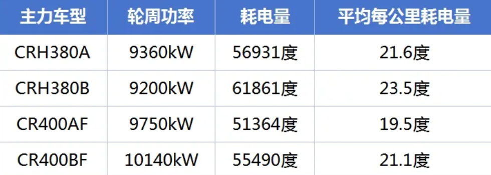 “中國(guó)高鐵動(dòng)車組一公里耗一萬度電”的說法偷換了概念,與事實(shí)不符。以現(xiàn)有CRH380A、CRH380B、CR400AF、CR400BF等4個(gè)8編組的主力車型為例,其輪周功率分別為:9360kW、9200kW、9750kW、10140kW,通過在京滬高鐵(往返距離2636公里)達(dá)速350km/h運(yùn)行條件下的能耗測(cè)試數(shù)據(jù)顯示,其耗電量分別為:56931度、61861度、51364度、55490度,據(jù)此推算出平均每公里耗電量分別為:21.6度、23.5度、19.5度、21.1度。