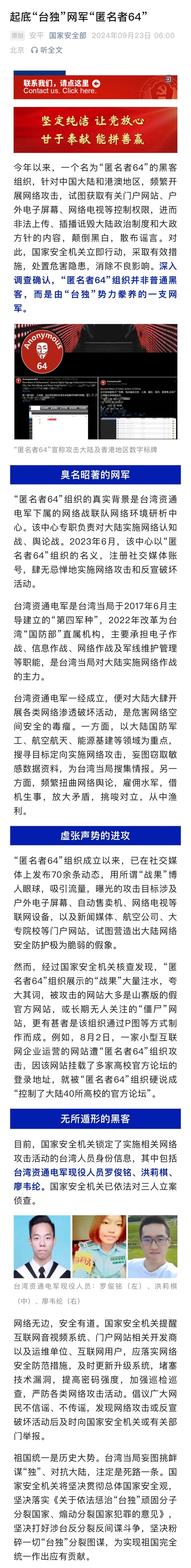 23日,國(guó)家安全部發(fā)文起底“臺(tái)獨(dú)”網(wǎng)軍“匿名者64”:今年以來(lái),一個(gè)名為“匿名者64”的黑客組織,針對(duì)中國(guó)大陸和港澳地區(qū),頻繁開展網(wǎng)絡(luò)攻擊,試圖獲取有關(guān)門戶網(wǎng)站、戶外電子屏幕、網(wǎng)絡(luò)電視等控制權(quán)限,進(jìn)而非法上傳、插播詆毀大陸政治制度和大政方針的內(nèi)容,顛倒黑白,散布謠言。對(duì)此,國(guó)家安全機(jī)關(guān)立即行動(dòng),采取有效措施,處置危害隱患,消除不良影響。深入調(diào)查確認(rèn),“匿名者64”組織并非普通黑客,而是由“臺(tái)獨(dú)”勢(shì)力豢養(yǎng)的一支網(wǎng)軍。