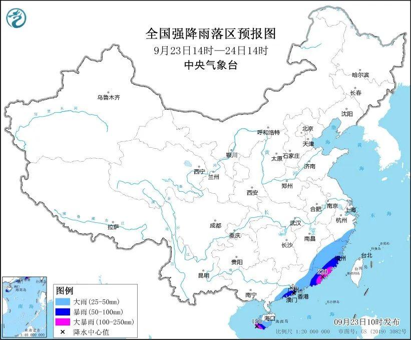 預(yù)計,9月23日14時至24日14時,浙江東南部、福建大部、廣東東部和南部、海南島等地部分地區(qū)有大到暴雨,其中,福建南部、廣東東部、海南島西南部等地部分地區(qū)有大暴雨(100~220毫米)。上述部分地區(qū)伴有短時強(qiáng)降水(最大小時降雨量20~40毫米,局地可超過50毫米)等強(qiáng)對流天氣。