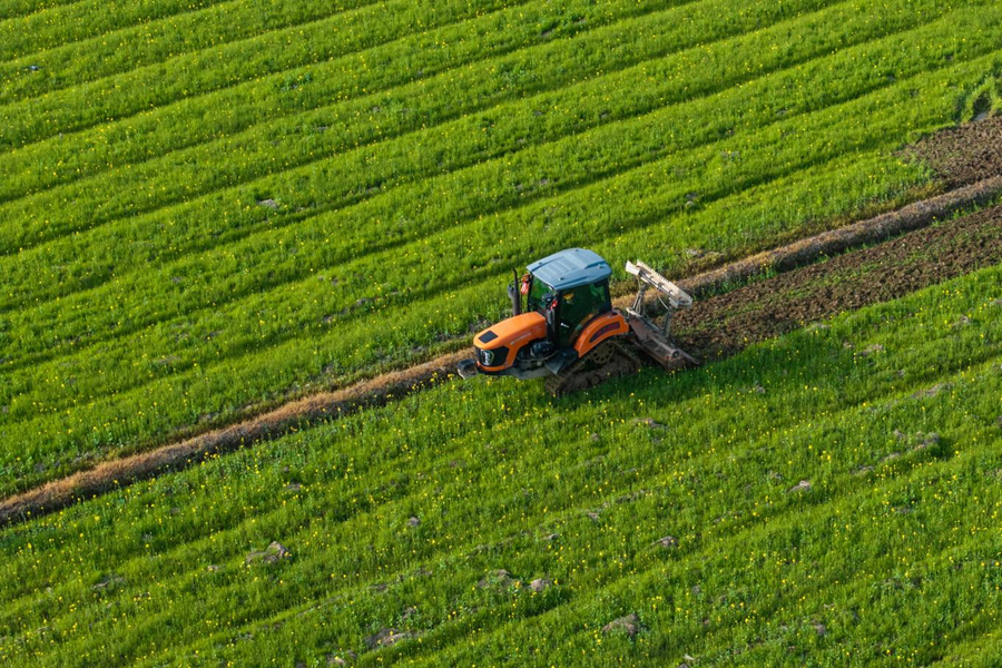 ?2024年3月19日,在湖南省常德市鼎城區(qū)謝家鋪鎮(zhèn)港中坪村,村民駕駛農(nóng)機翻耕田地(無人機照片)。新華社記者 陳思汗 攝