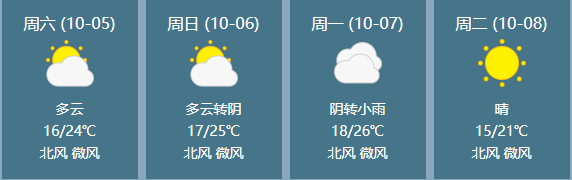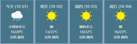 10月1日:陰天有小雨,北風(fēng)4到5級(jí),氣溫16到20℃。