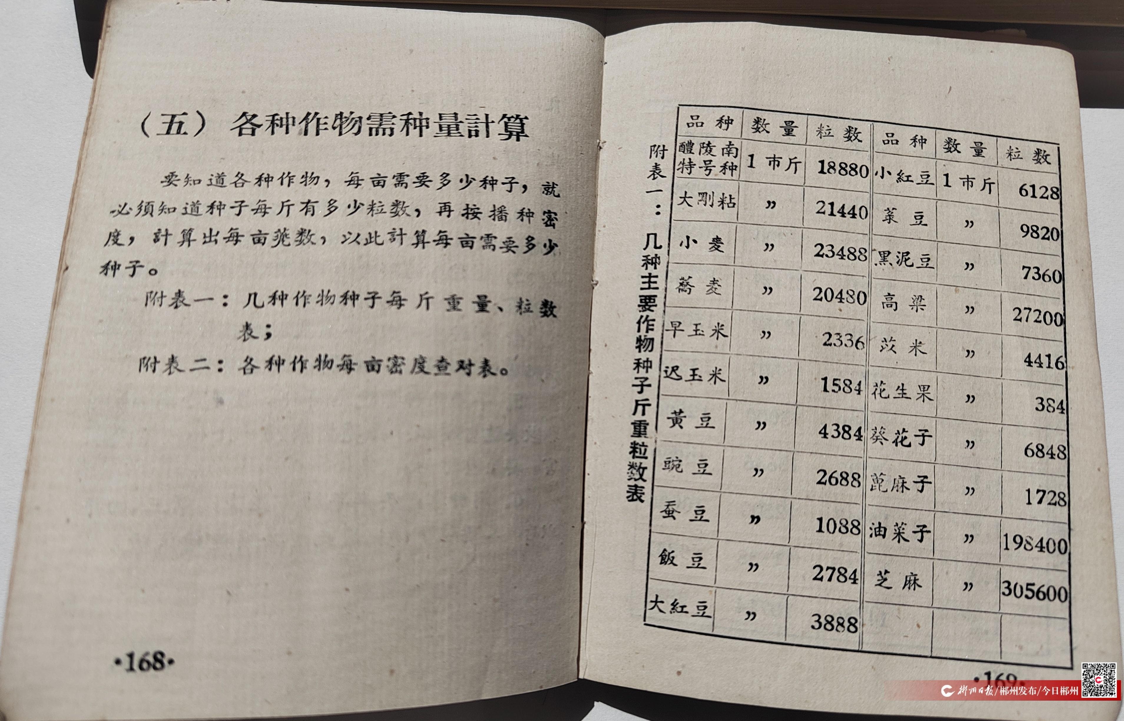 在第四章“種子工作基本知識”中,除了記錄種子處理、選育、防退化等基本農業(yè)知識外,更讓記者感興趣的是第五節(jié)“各種作物需種量計算”中的附表一:幾種主要作物種子斤重粒數表。從此表中可知,1斤種子粒數最少的是花生,有384粒;最多的是芝麻,達305600粒;第二多的是油菜籽,達198400粒??梢姰敃r的農業(yè)工作者工作多么認真細致!