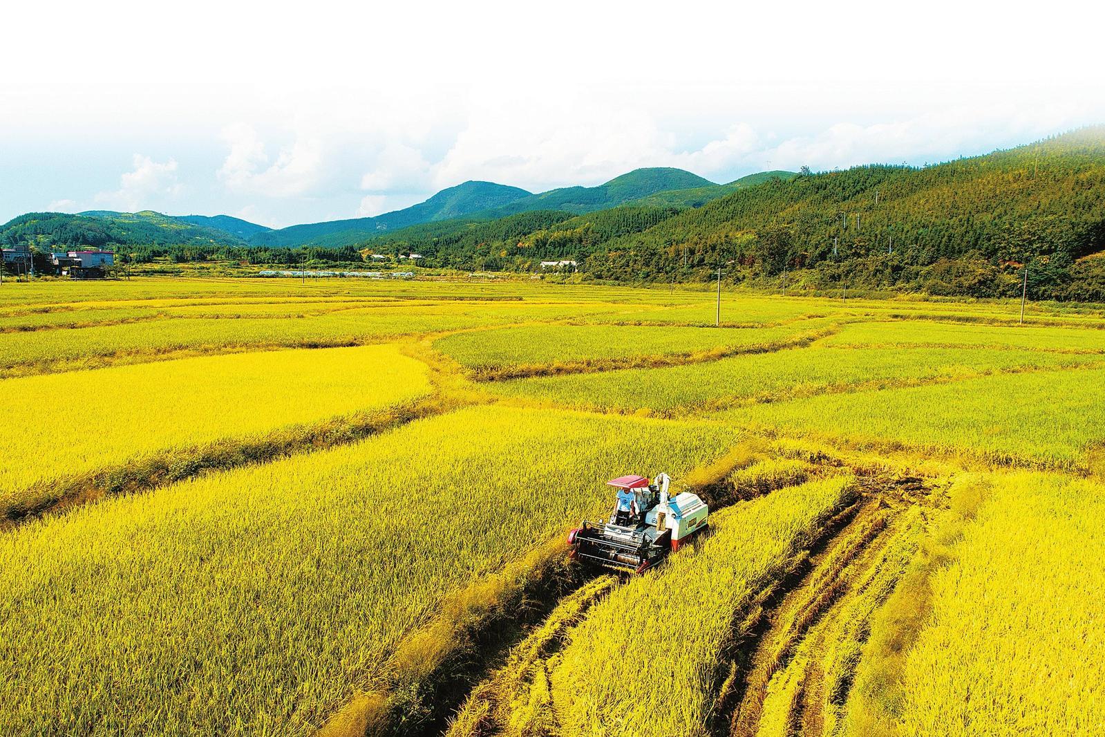 金秋時節(jié),在桂陽縣太和鎮(zhèn)車田村,只見稻田里沉甸甸的稻穗壓彎了稻稈,幾臺聯合收割機在金黃色的田野里穿梭忙碌,切割、脫粒、粉碎秸稈等工序一氣呵成?!敖衲晖淼井a量比去年高,現在大型機械直接開進田里,省心又省力?!狈N植戶陳躍進說。