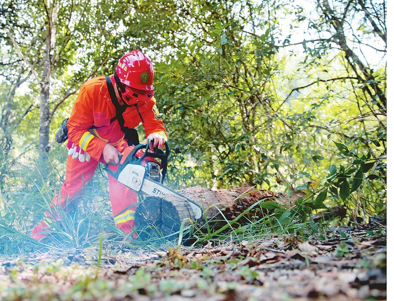 森林防滅火應急隊員在訓練用油鋸清理隔火道 (鄧仁湘 攝)