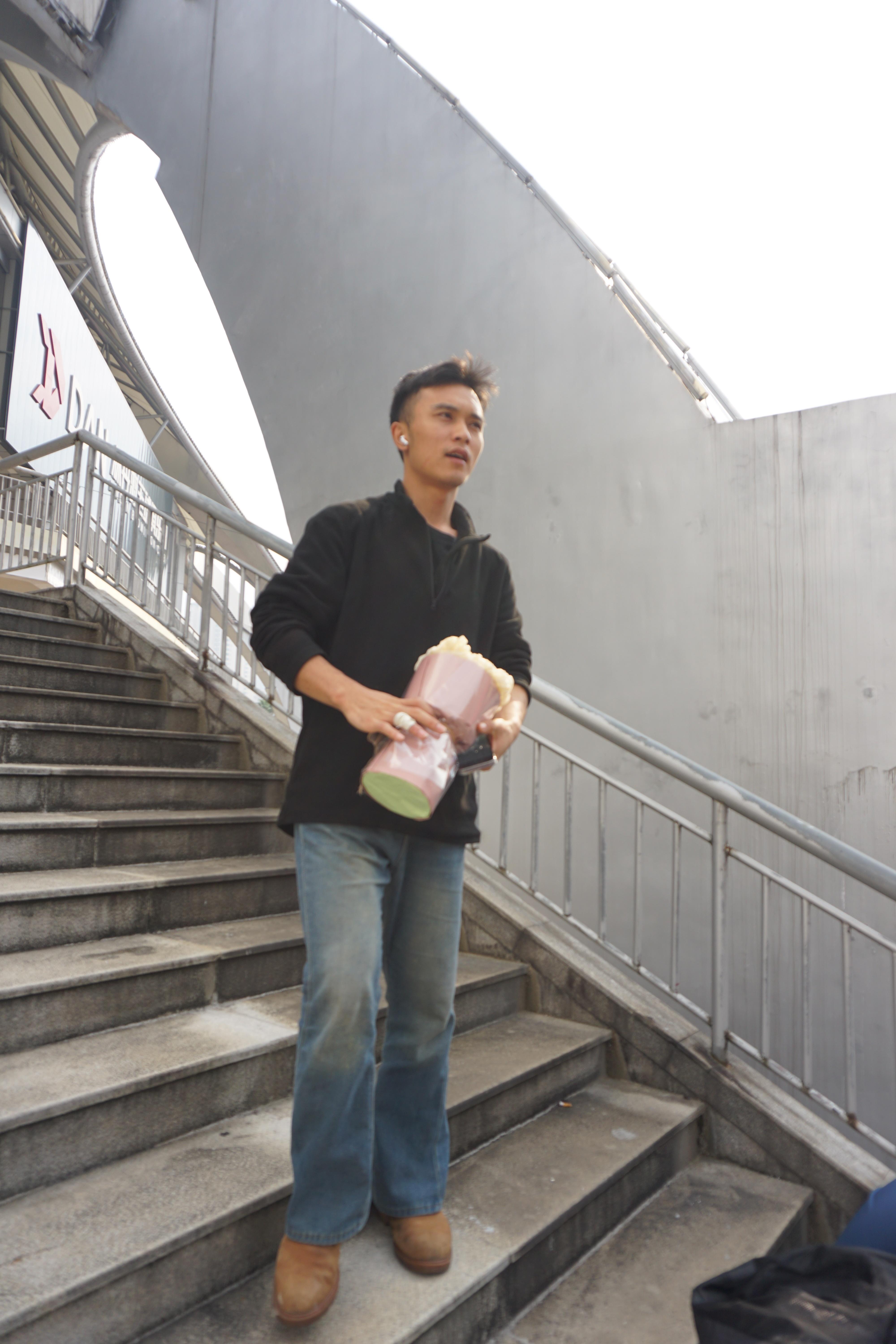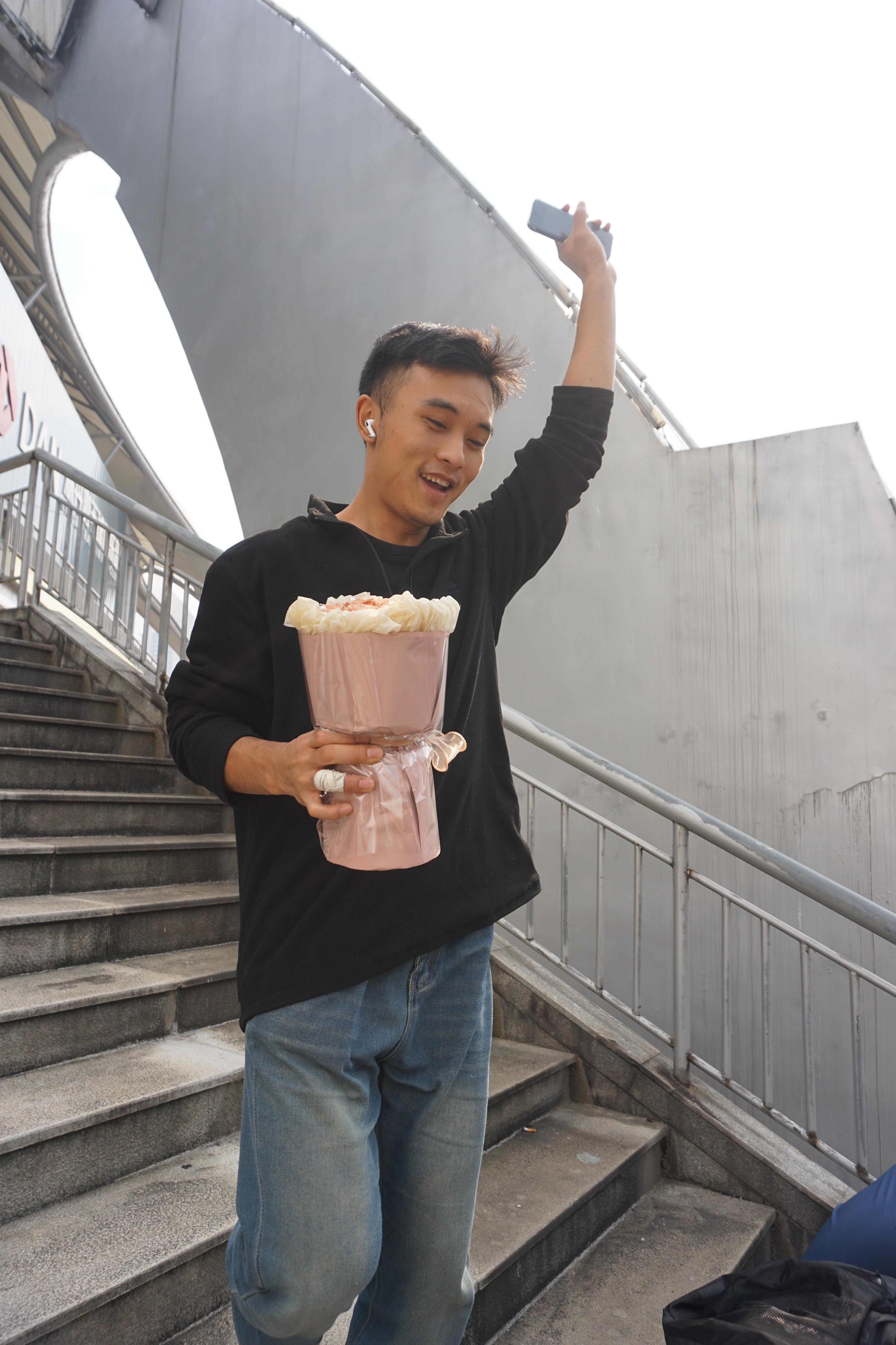 11月10日上午,楊智捷特意帶著一束粉色鮮花,來到馬拉松選手出口處等待正在跑半馬的女朋友。遠遠地,剛看見女朋友的身影出現(xiàn)在人群中,他立刻抱起鮮花從樓梯上跳起來,一邊揮手一邊蹦跳著小跑向前,為女朋友送上鮮花和補給。