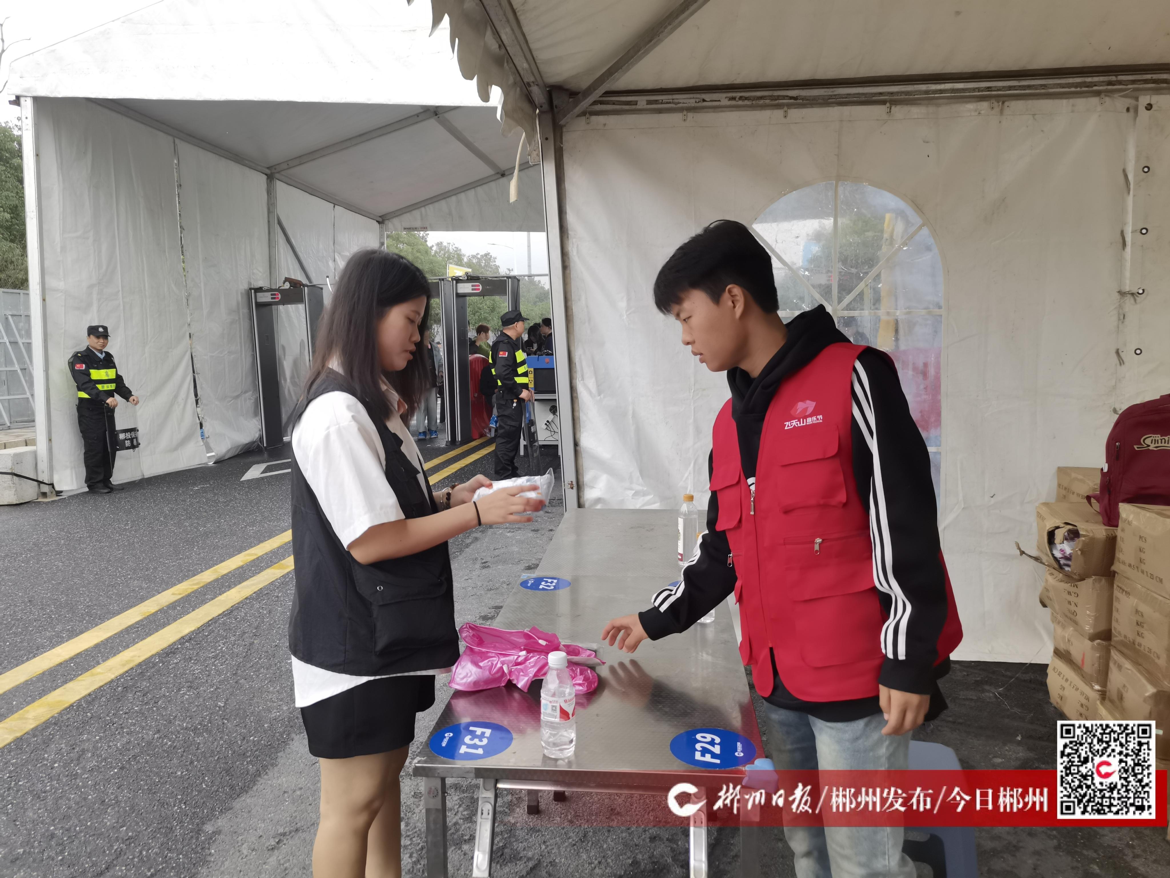 11月16日上午,飛天山音樂節(jié)開唱前,60余名志愿者整裝待發(fā)。這批志愿者來自郴州各大高校,將在音樂節(jié)期間為觀眾進行檢票引導、指路、免費發(fā)放雨鞋雨衣等志愿服務。
