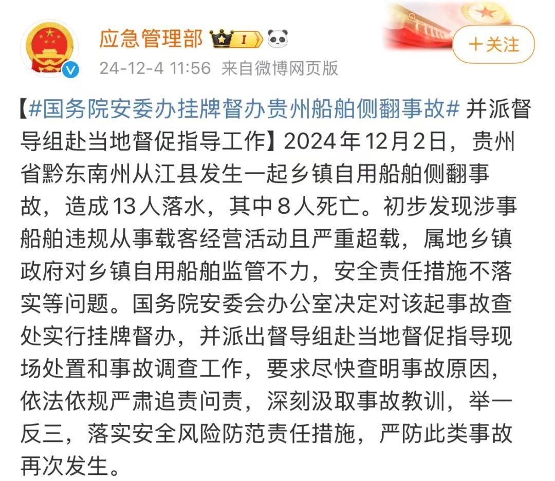 據(jù)@應(yīng)急管理部 今天(12月4日)中午消息,2024年12月2日,貴州省黔東南州從江縣發(fā)生一起鄉(xiāng)鎮(zhèn)自用船舶側(cè)翻事故,造成13人落水,其中8人死亡。