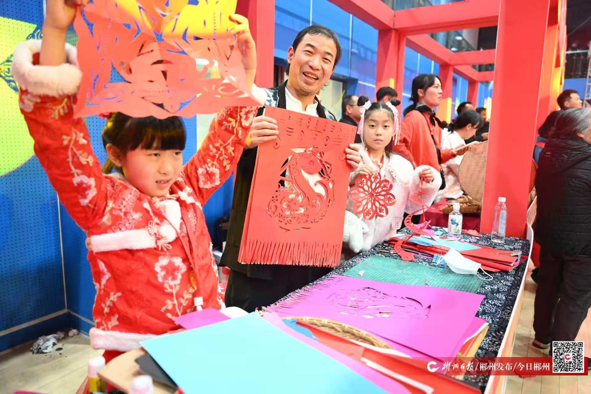 晚會現(xiàn)場的鄺氏手工剪紙、江氏手編繩、魯塘砂罐的“非遺街”,以及對聯(lián)集市、小吃集市吸引不少觀眾前來合影。