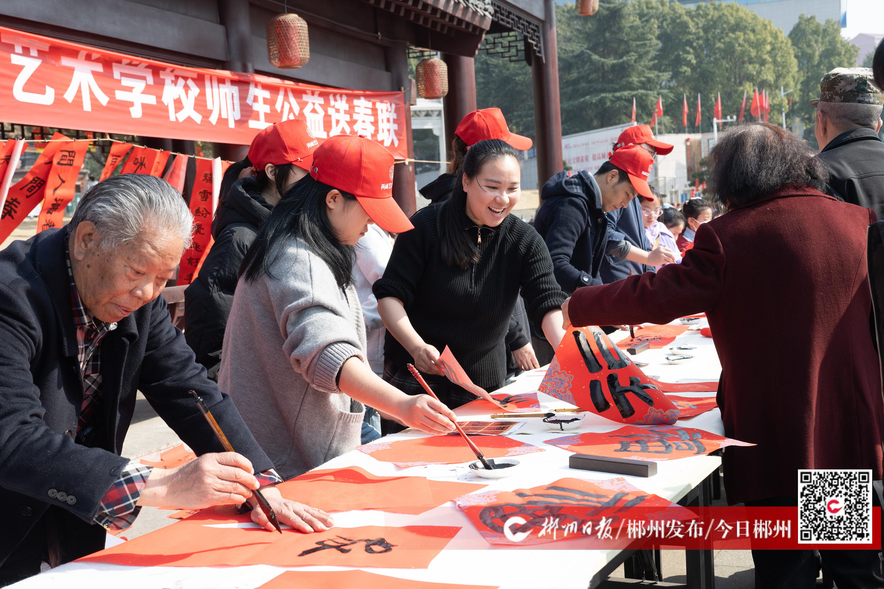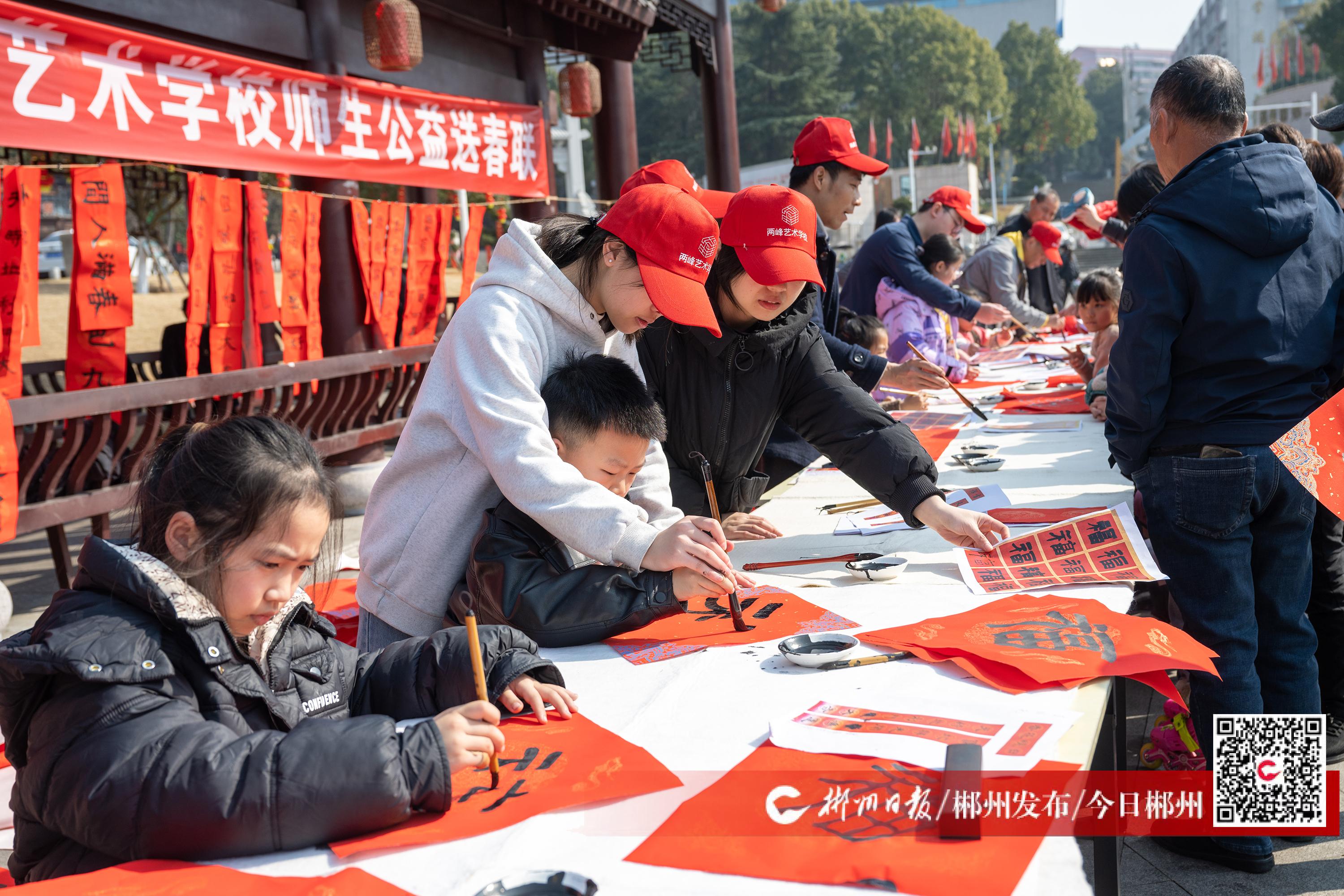 1月21日,多家企業(yè)在蘇仙區(qū)蘇仙嶺街道開展送春聯(lián)公益活動(dòng),邀請(qǐng)書法愛好者及小朋友現(xiàn)場(chǎng)書寫春聯(lián),感受傳統(tǒng)文化魅力,迎接蛇年新春的到來。