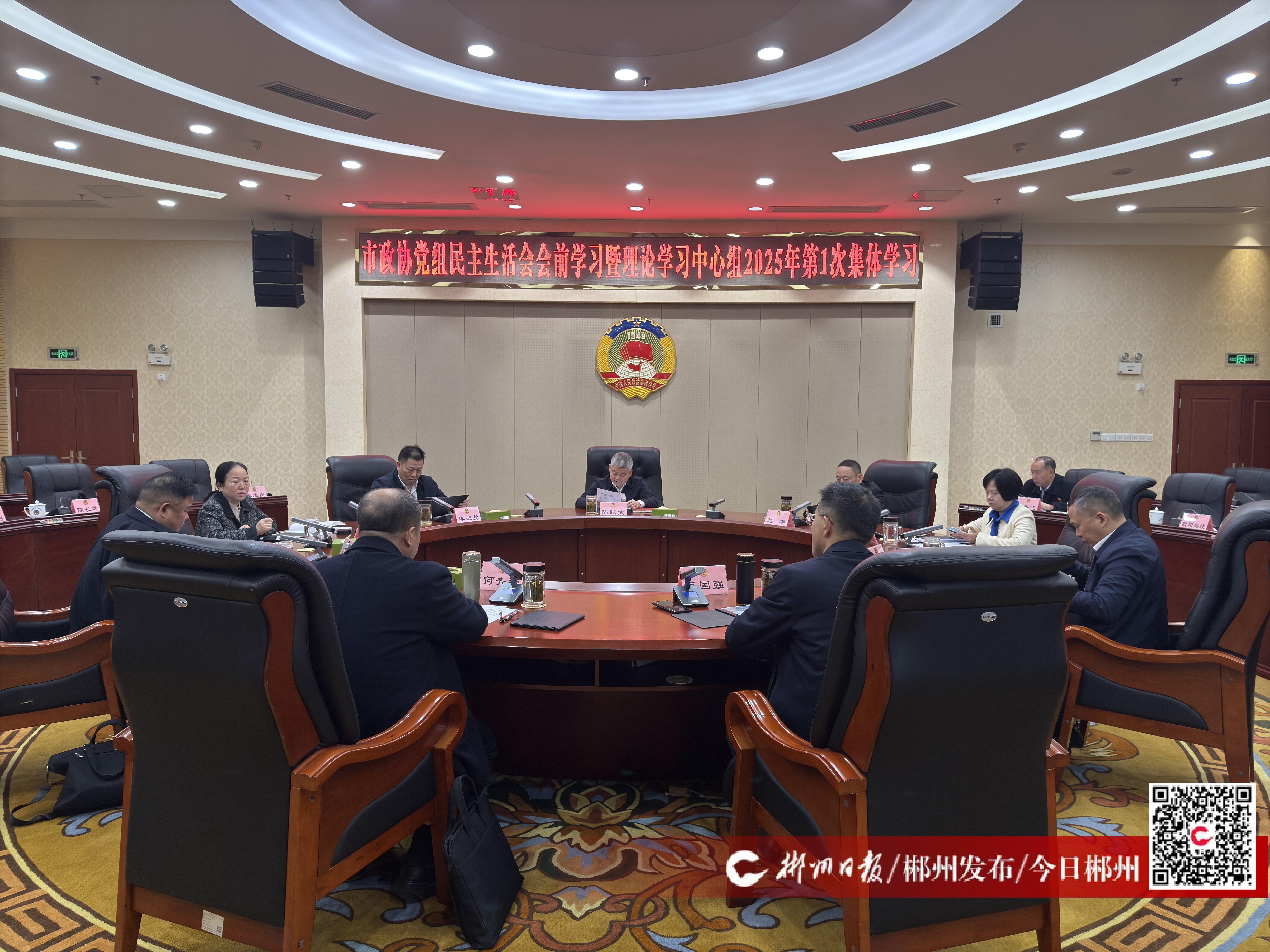 1月24日,市政協(xié)黨組民主生活會(huì)會(huì)前學(xué)習(xí)暨理論學(xué)習(xí)中心組2025年第1次集體學(xué)習(xí)舉行。會(huì)議深入學(xué)習(xí)貫徹習(xí)近平新時(shí)代中國(guó)特色社會(huì)主義思想和黨的二十屆三中全會(huì)精神,認(rèn)真學(xué)習(xí)領(lǐng)會(huì)習(xí)近平總書(shū)記關(guān)于全面加強(qiáng)黨的紀(jì)律建設(shè)的重要論述及在中共中央政治局民主生活會(huì)和二十屆中央紀(jì)委四次全會(huì)上的重要講話(huà)精神,鞏固深化黨紀(jì)學(xué)習(xí)教育成果,打牢開(kāi)好民主生活會(huì)的思想基礎(chǔ)。市政協(xié)黨組書(shū)記、主席陳躍文主持會(huì)議。
