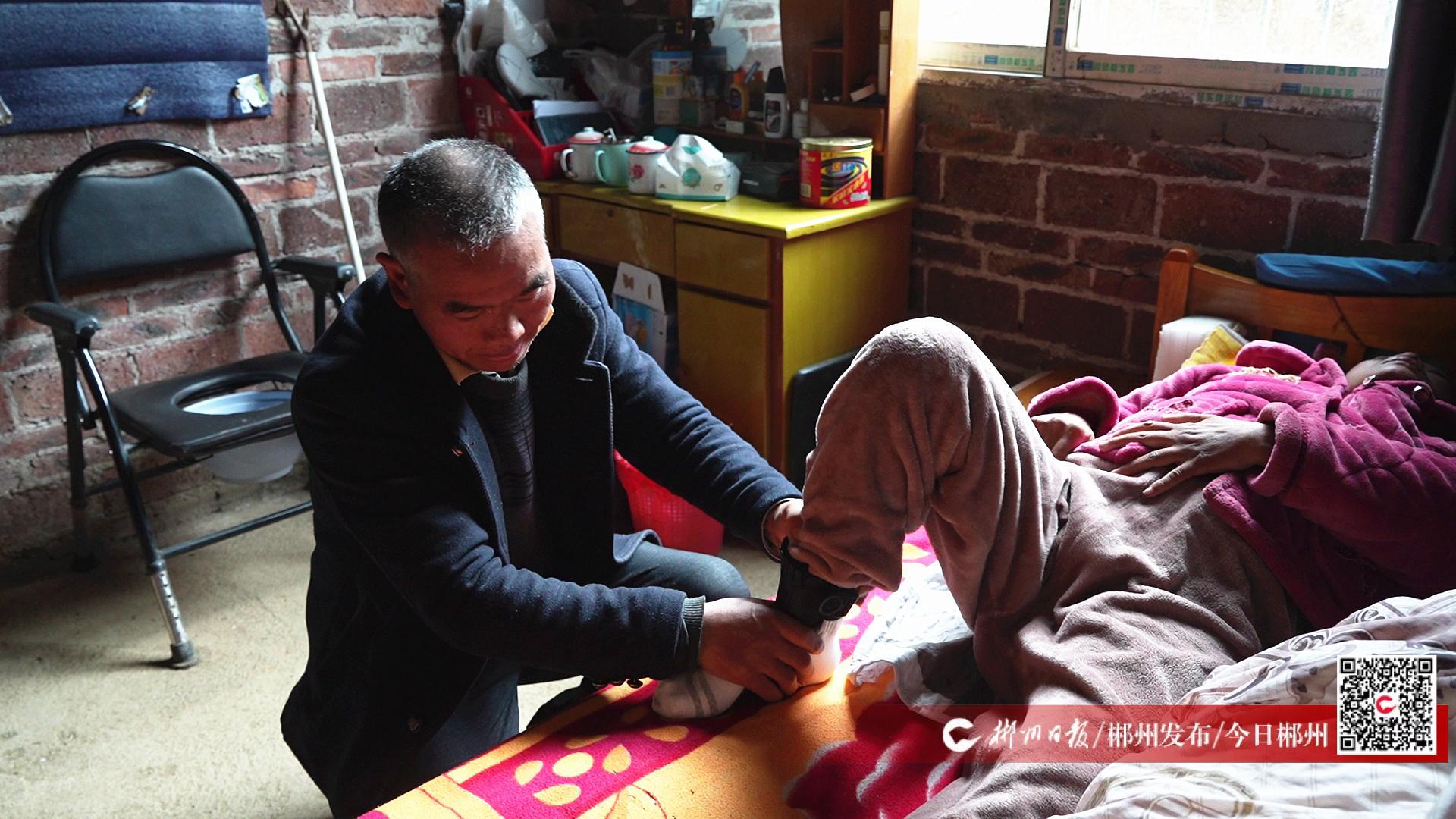 從腳趾到頭頂,依次反復(fù)揉按,每天三次,每次持續(xù)一小時(shí)……這是楊禮好每天都要完成的“工作”。楊禮好衣著不新,卻干凈利落。平日里除了接一些裝修工程,他還獨(dú)自照顧“植物人”妻子羅滿華。