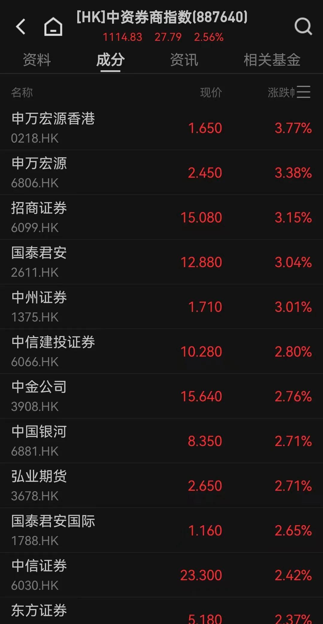 港股券商股同步走強(qiáng),國(guó)泰君安、申萬(wàn)宏源、招商證券等均漲超3%。