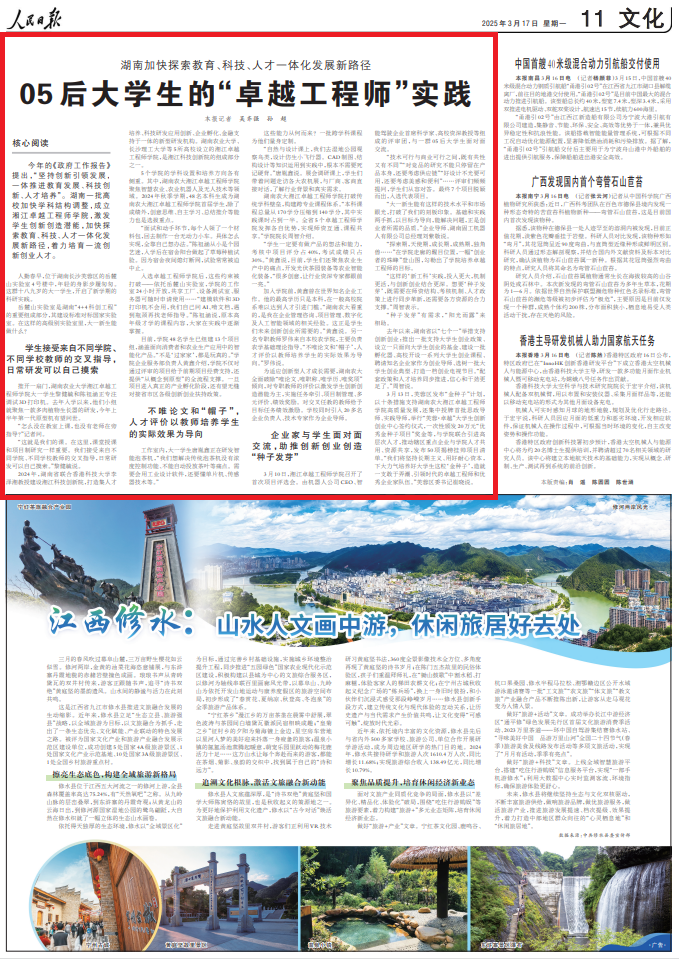 今年的《政府工作報(bào)告》提出,“堅(jiān)持創(chuàng)新引領(lǐng)發(fā)展,一體推進(jìn)教育發(fā)展、科技創(chuàng)新、人才培養(yǎng)”。湖南一批高校加快學(xué)科結(jié)構(gòu)調(diào)整,成立湘江卓越工程師學(xué)院,激發(fā)學(xué)生創(chuàng)新創(chuàng)造潛能,加快探索教育、科技、人才一體化發(fā)展新路徑,著力培育一流創(chuàng)新創(chuàng)業(yè)人才。