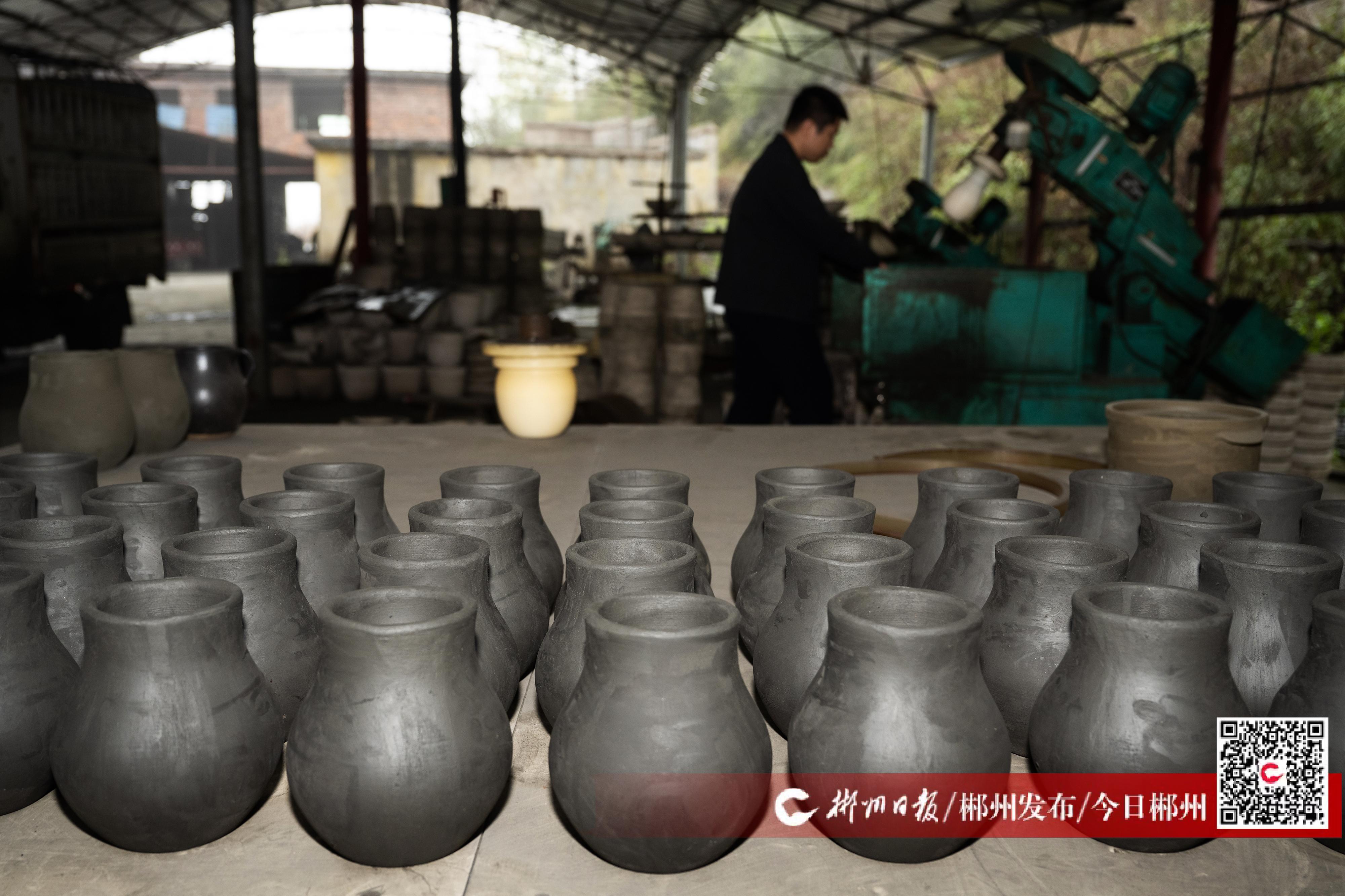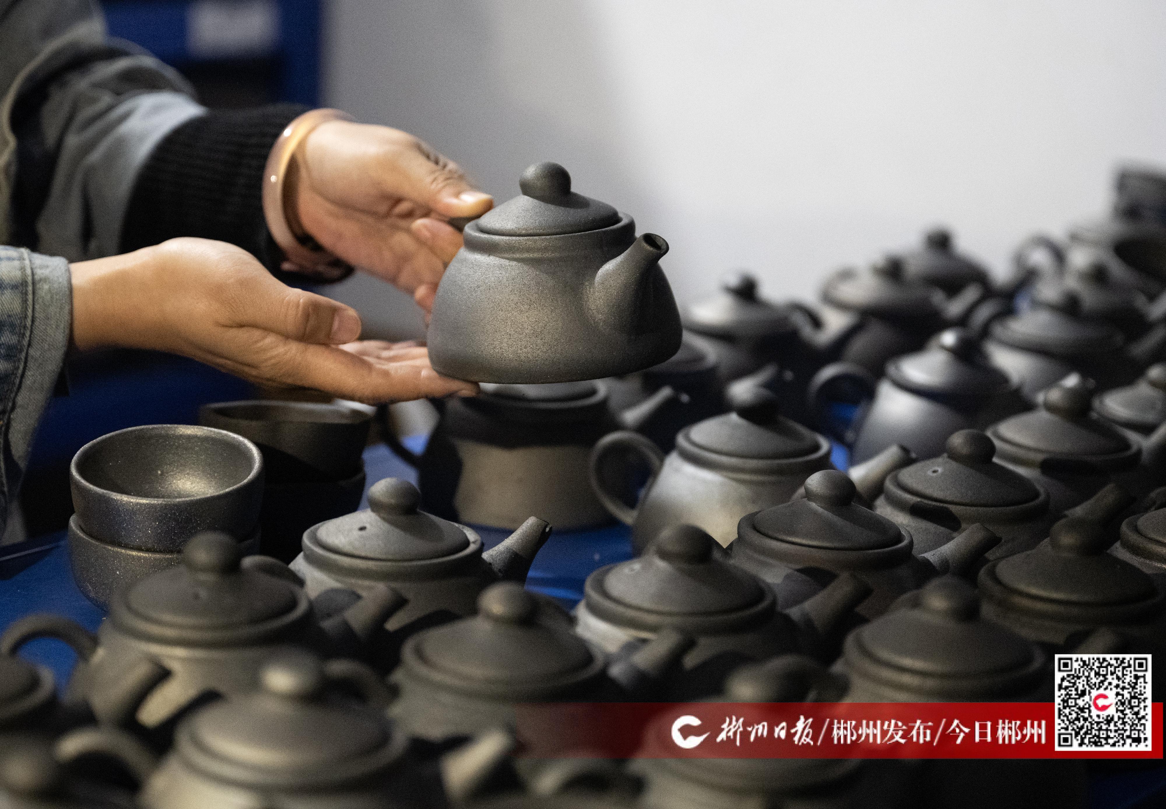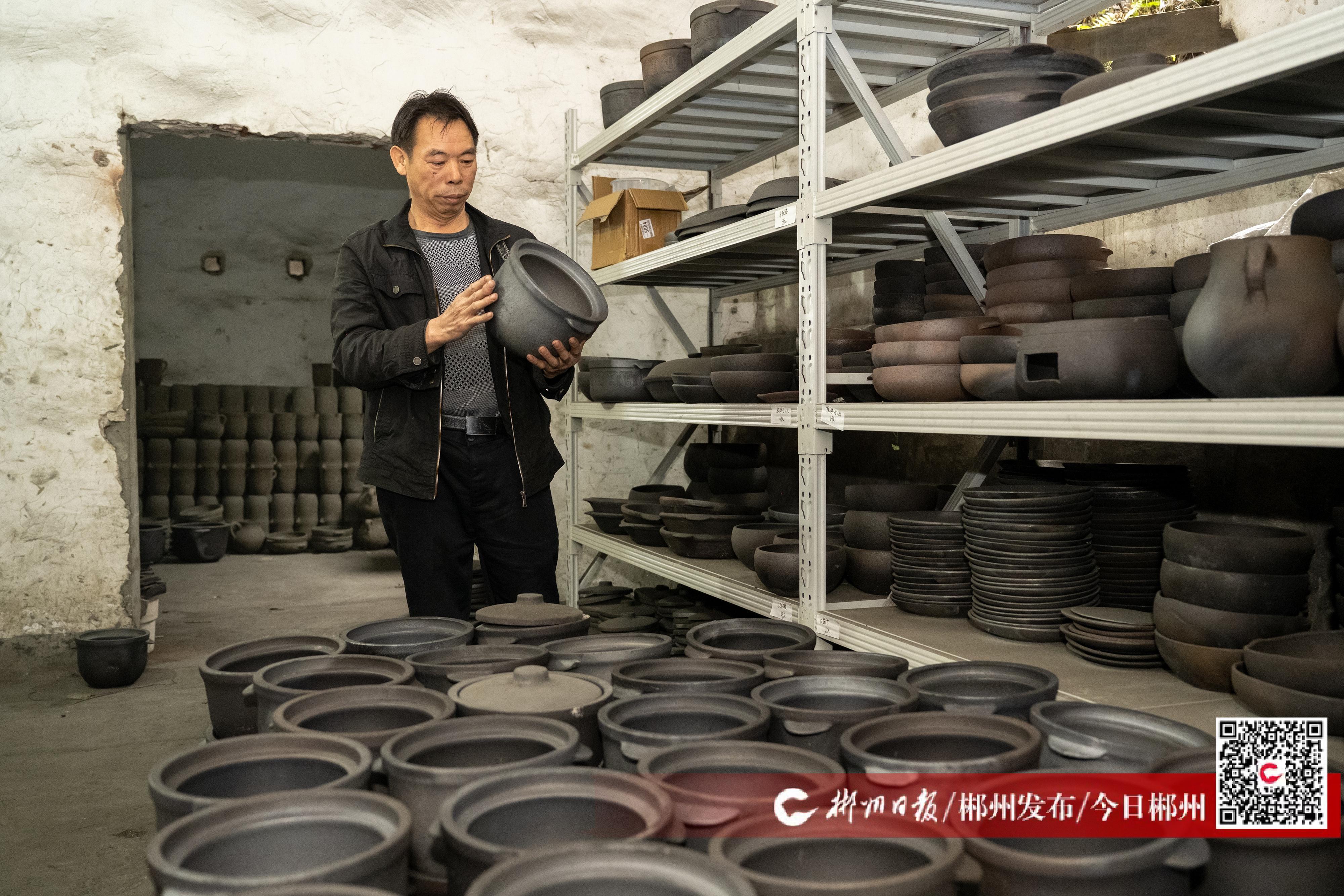 3月13日,在郴州市北湖區(qū)何氏陶藝有限公司的非遺工坊內(nèi),陳列著形態(tài)古樸的砂杯、砂盤、砂缽?!坝敏斕辽肮拗蟪鰜淼氖澄锉ur期可延長至原來的三倍左右,用它燉肉,無腥膻氣;用它煎藥,藥性不變……”手捧如墨的砂杯,魯塘砂罐第二十代傳承人何善平向游客介紹自己燒制的寶貝。