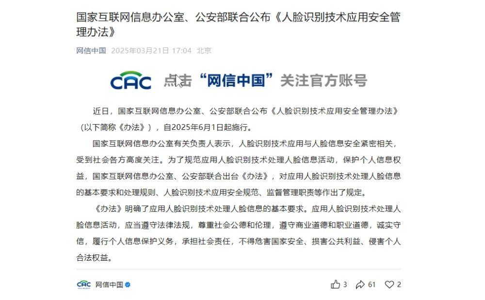 近日,國家互聯(lián)網(wǎng)信息辦公室、公安部聯(lián)合公布《人臉識別技術(shù)應(yīng)用安全管理辦法》(以下簡稱《辦法》),自2025年6月1日起施行。