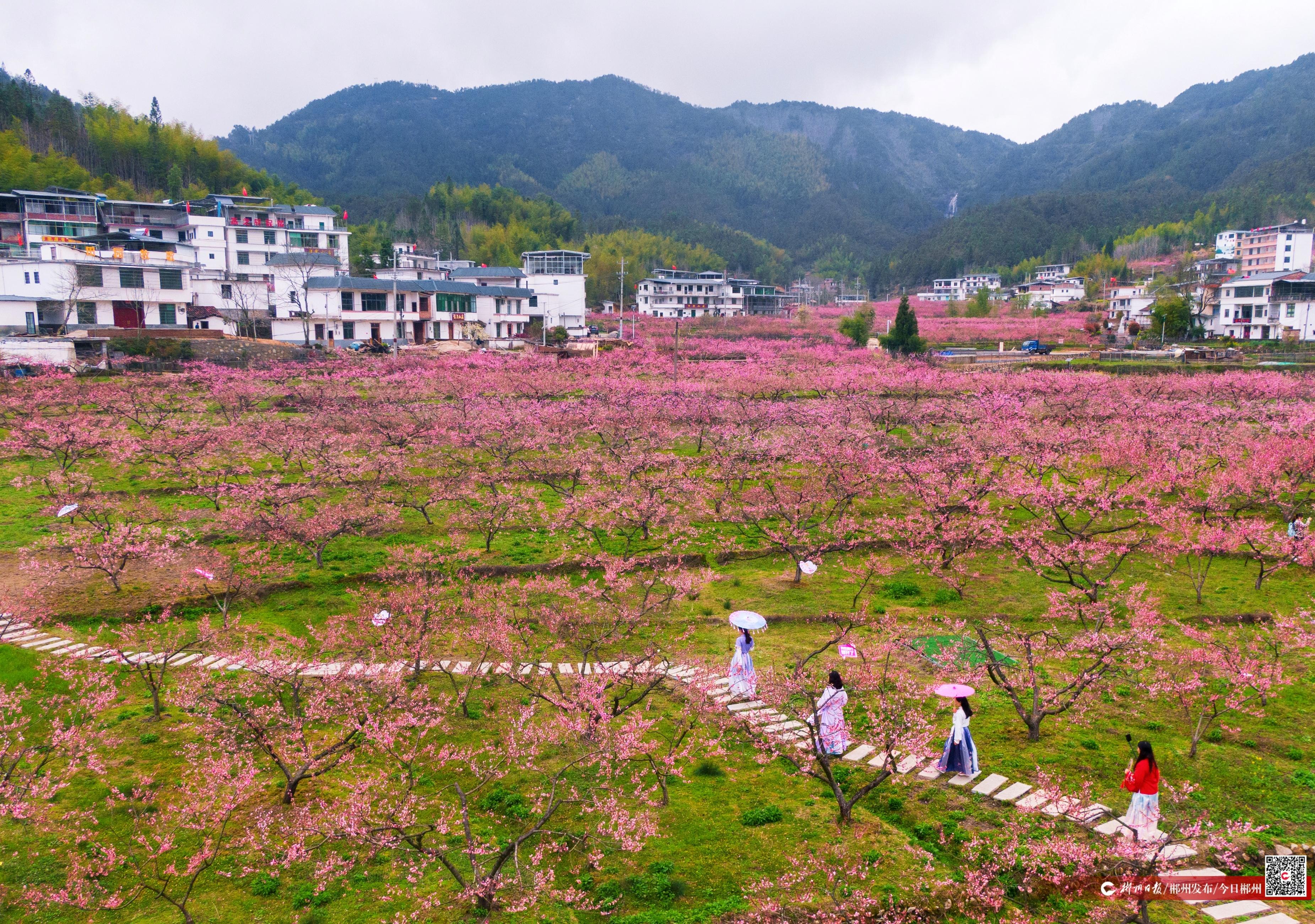 桂東縣漚江鎮(zhèn)青竹村百畝桃林映襯成片民宿