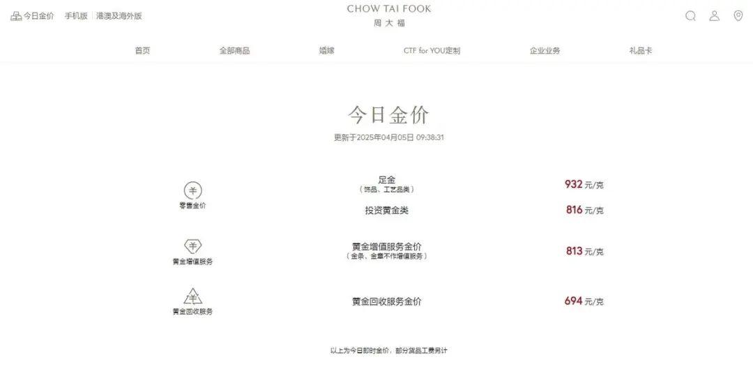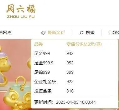 4月5日上午,記者再次查詢上述黃金珠寶品牌官網(wǎng)發(fā)現(xiàn),周大福足金(飾品、工藝品類)、六福珠寶足金999、周六福足金飾品境內(nèi)價(jià)格分別為932元/克;老廟黃金上海區(qū)域足金飾品價(jià)格為931元/克。按此計(jì)算,上述品牌金飾克價(jià)兩天均跌30元/克。