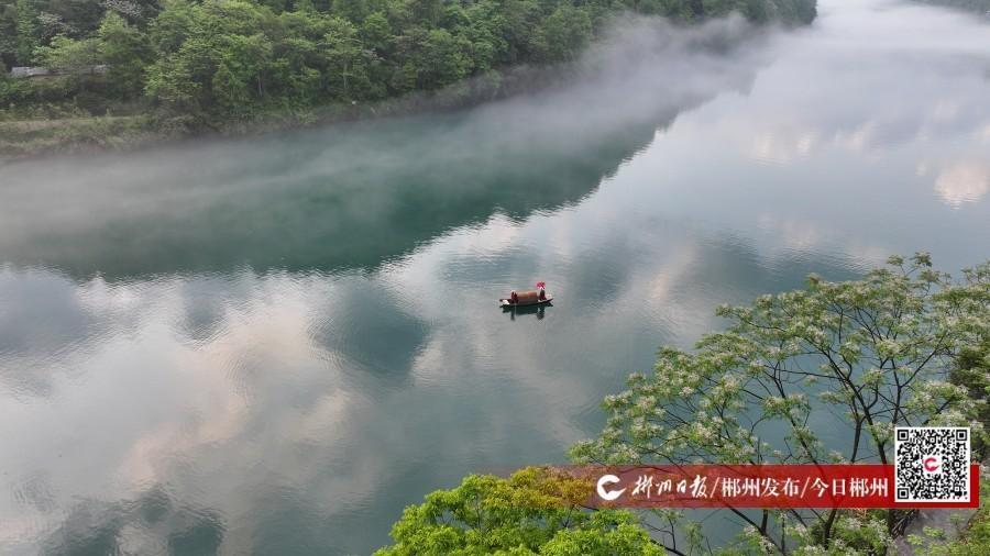 4月19日清晨,郴州資興市小東江薄霧縹緲,兩岸山花爛漫,水天一色,漁夫漁船與滿屏青綠相映成趣。