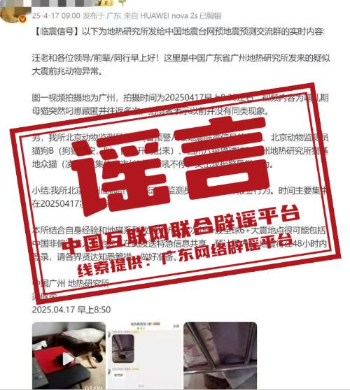 真相:4月17日上午9時(shí),一位新浪微博認(rèn)證為“科學(xué)科普博主”、IP屬地顯示在廣東的網(wǎng)民發(fā)文稱:“根據(jù)動(dòng)物行為異常、地磁波動(dòng)、經(jīng)驗(yàn)數(shù)據(jù)分析等,判斷將在48小時(shí)內(nèi)發(fā)生6級(jí)以上強(qiáng)震”,引發(fā)關(guān)注。對(duì)此,4月17日晚,廣州市地震局表示,動(dòng)物異常行為與地震無必然因果關(guān)系。18日,廣州市應(yīng)急管理局回應(yīng),目前,廣州市地震活動(dòng)基本正常,地球物理觀測(cè)沒有顯著變化。動(dòng)物異常的因素多種多樣,宏觀動(dòng)物異常與地震發(fā)生沒有一一對(duì)應(yīng)的關(guān)系。此外,根據(jù)現(xiàn)今地震預(yù)測(cè)的實(shí)際水平,很難做到非常精確地對(duì)地震時(shí)、空、強(qiáng)度的預(yù)測(cè),所謂精準(zhǔn)的“地震預(yù)測(cè)”是不可信的,也是多年反復(fù)在各地出現(xiàn)的地震謠言,只不過換成了當(dāng)?shù)氐牡孛?。在此鄭重提醒大家:只有政府有?quán)發(fā)布地震預(yù)報(bào),其他任何部門、單位或個(gè)人都無權(quán)發(fā)布地震預(yù)報(bào)。因此切勿相信與地震有關(guān)的一切非官方信息,更勿傳謠,不讓謠言造成二次傷害。(來源:@應(yīng)急管理部、“廣東省互聯(lián)網(wǎng)舉報(bào)中心”微信公眾號(hào))