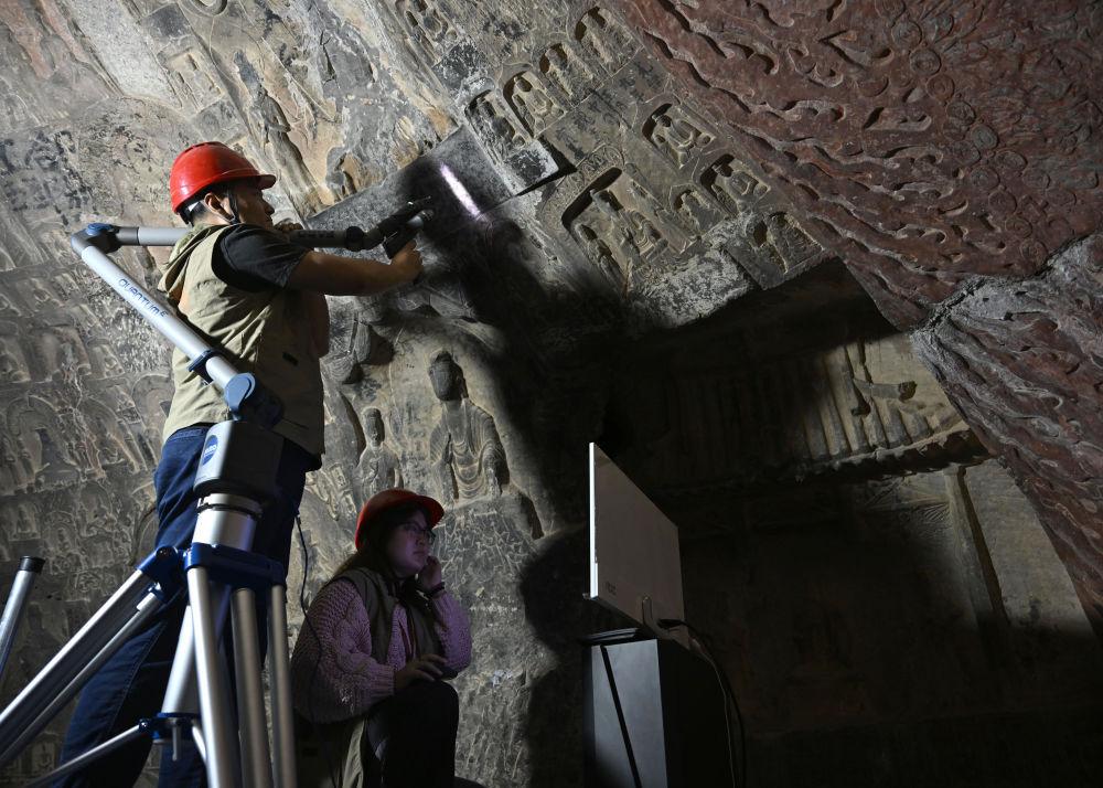 2025年4月9日,龍門石窟研究院工作人員在古陽(yáng)洞使用關(guān)節(jié)臂掃描儀對(duì)像龕進(jìn)行數(shù)字化掃描。