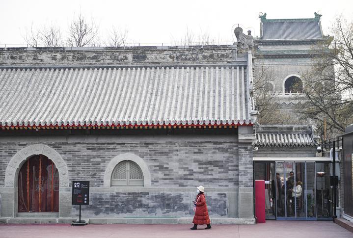 ▲2024年1月18日拍攝的宏恩觀山門殿與觀外的北京鐘樓。宏恩觀地處北京鐘鼓樓北側(cè)、北京中軸線北端,擁有700余年歷史,被稱為中軸線上的“龍尾之要”。如今,通過保護(hù)性修繕與活化利用,宏恩觀成為涵蓋數(shù)字藝術(shù)展、宏恩觀歷史展、中軸線主題郵局、書店、文創(chuàng)商店等內(nèi)容的市民文化空間。