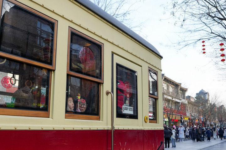 ▲2025年1月29日,游客在前門大街乘坐“鐺鐺車”觀光游覽。