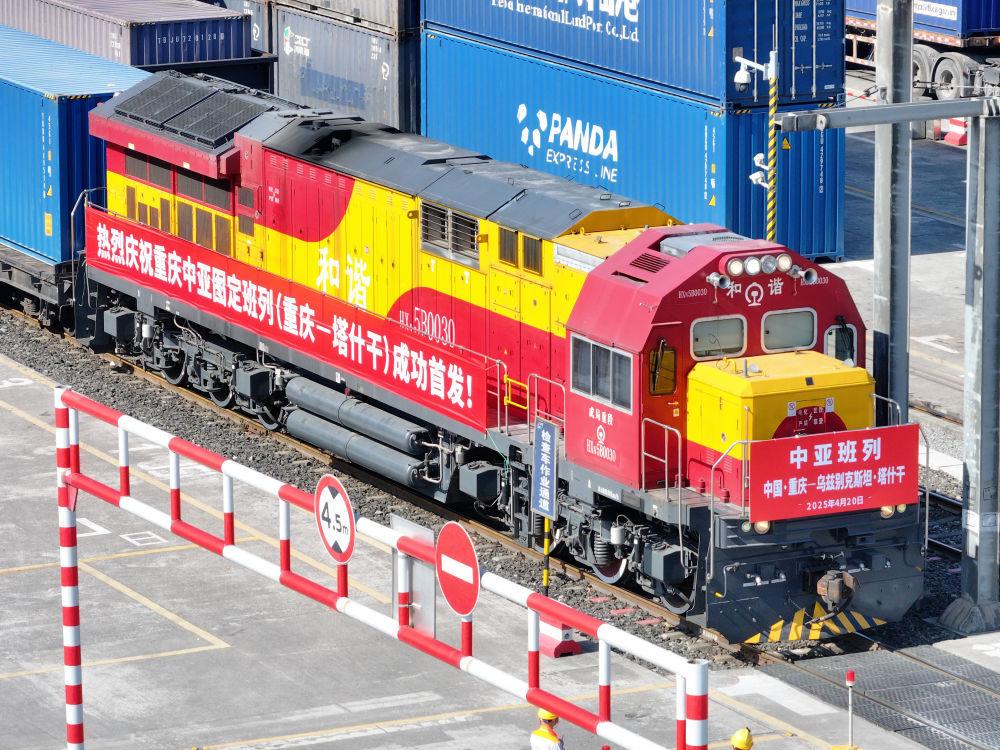 ▲4月20日,圖定中亞班列在重慶團(tuán)結(jié)村中心站等候發(fā)車(無人機(jī)照片)。新華社記者 唐奕 攝