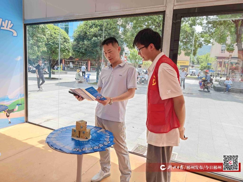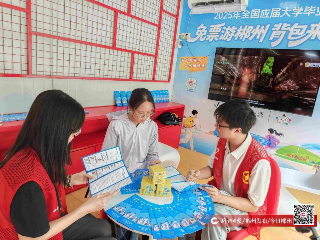 驛站內(nèi),休息區(qū)的大屏幕循環(huán)播放霧漫小東江、高椅嶺丹霞等郴州特色景點宣傳片,桌上整齊擺放著《創(chuàng)業(yè)郴州 萬事無憂》政策手冊。志愿者曹永富正熱情地向畢業(yè)生鄭瑤介紹文旅優(yōu)惠政策:“憑活動報名二維碼,可享受東江湖、飛天山、仰天湖、莽山等16家4A級景區(qū)免門票優(yōu)惠,景區(qū)內(nèi)的車、船、索道等交通項目還可享半價?!贝送?,他還向鄭瑤展示了可兌換的礦晶文創(chuàng)盲盒。