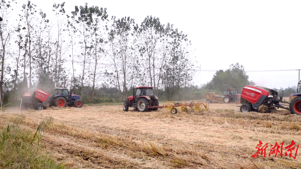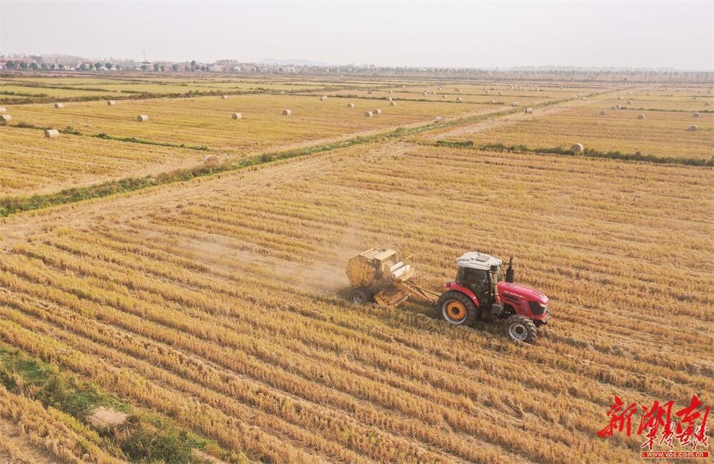 (岳陽市屈原管理區(qū)鳳凰鄉(xiāng),專業(yè)秸稈回收機將田間秸稈統(tǒng)一收集,打捆成垛)