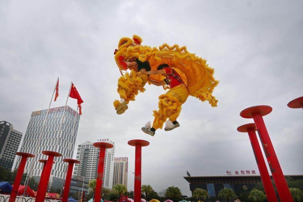 ▲2025年1月22日,鶴山禧誠(chéng)龍獅隊(duì)在廣東省佛山市禪城區(qū)南莊鎮(zhèn)進(jìn)行梅花樁舞獅表演。