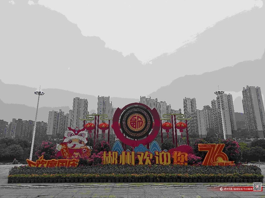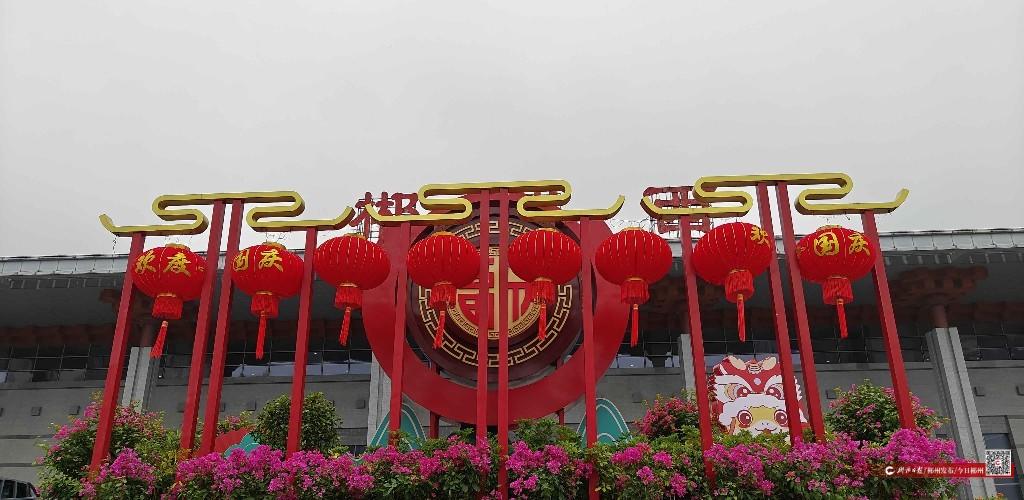 在郴州西站,城市道路綠化隊以“歡度國慶”和“郴州歡迎您”為主題,用鮮艷的紅色和黃色立體字表達(dá)了對祖國的熱愛和對游客的熱烈歡迎?;▔醒耄粋€巨大的“?!弊盅b飾,寓意著對祖國和人民的美好祝福。