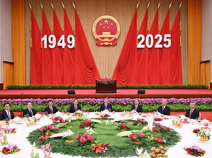 人民大會(huì)堂宴會(huì)廳華燈璀璨,洋溢著喜慶熱烈的節(jié)日氛圍。主席臺(tái)上方高懸著莊嚴(yán)的國(guó)徽,“1949-2025”大字年號(hào)在鮮艷紅旗映襯下格外醒目。