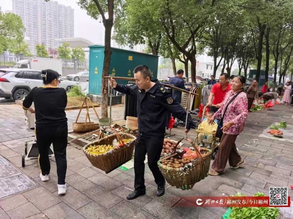 ▲城管執(zhí)法人員柔性執(zhí)法,對(duì)進(jìn)城占道賣菜農(nóng)民教育勸導(dǎo),幫助農(nóng)民將菜挑至市場(chǎng)內(nèi)指定地點(diǎn)銷售