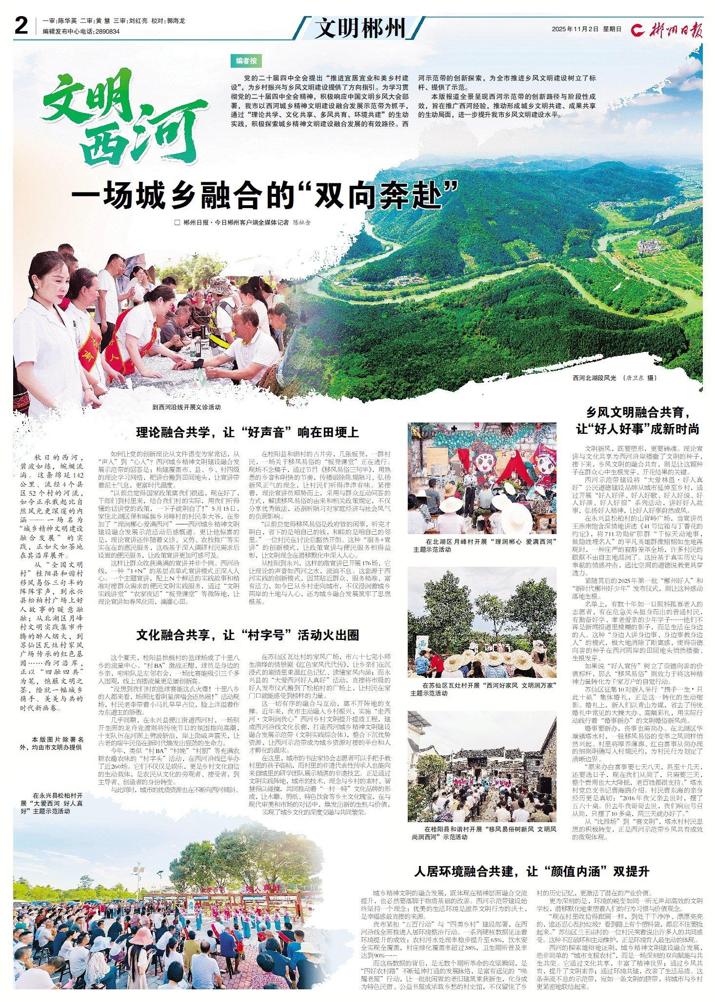 從“全國文明村”桂陽縣和諧村移風易俗三句半的陣陣掌聲,到永興縣松柏村廣場上好人故事的暖意融融;從北湖區(qū)月峰村文明實踐集市升騰的醉人煙火,到蘇仙區(qū)瓦灶村家風廣場傳承的紅色基因……西河沿岸,正以“四融四共”為筆,飽蘸文明之墨,繪就一幅城鄉(xiāng)攜手、美美與共的時代新畫卷。