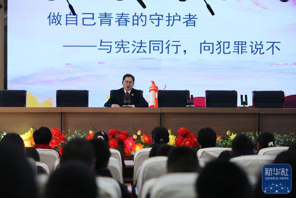 ↑12月2日,甘肅省定西市安定區(qū)人民檢察院的檢察官在中華路學(xué)校進(jìn)行憲法相關(guān)知識(shí)宣講。