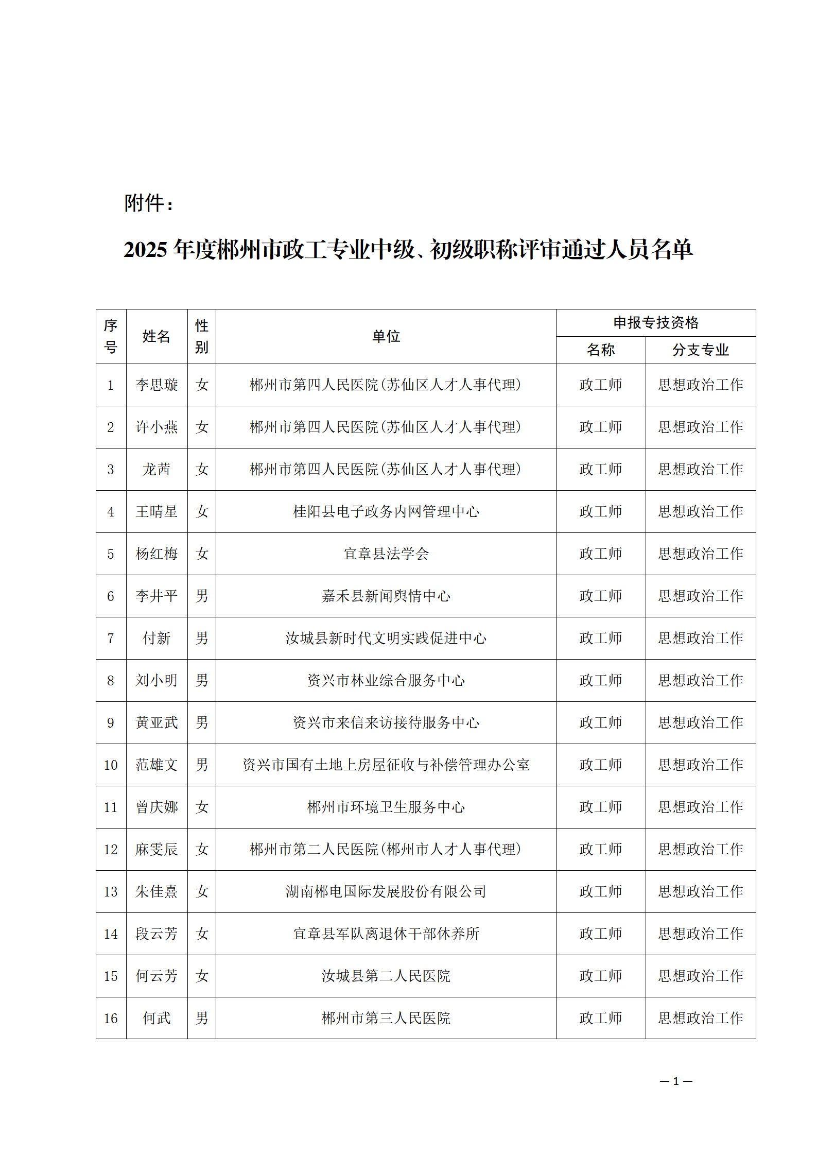 附件:2025年度郴州市政工專業(yè)中級(jí)、初級(jí)職稱評(píng)審?fù)ㄟ^(guò)人員名單