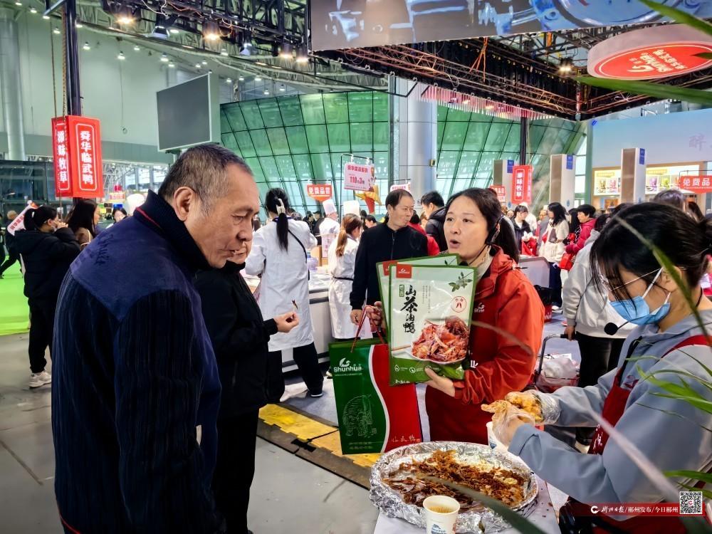 展會上,四處都是熱鬧的招呼聲,美食的香味隨著風(fēng),填滿整個會場。不同的攤位上,市民們品嘗著本地的臨武鴨、壇子菜、臍橙、香米,買到江西的茶、湘西的臘肉、山西的陳醋、河南的梨,還能在各縣市區(qū)的展館里看到、買到最正宗的“郴品郴味”……